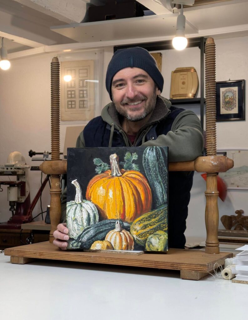 Livraison avant expédition de mon tableau « Portrait de Courges », une peinture à l’huile sur toile, qui est destinée à un honorable collectionneur rencontré auprès de la Librairie-galerie Laure Matarasso à Nice. Je sais que le tableau partira très bientôt pour le nord de la France !