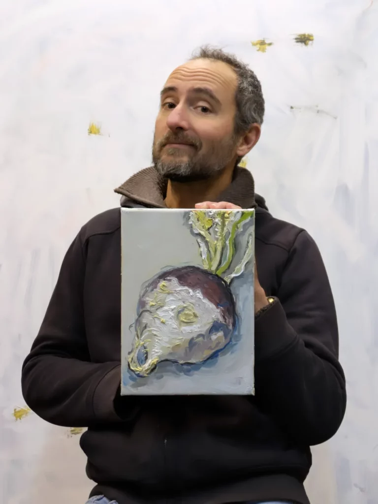 Mon « Portrait de Navet » est terminé ! Reste le temps du séchage, qui devrait prendre un mois et demi pour ce tableau, puis de l’expédition. Un grand merci au collectionneur qui m’a fait confiance et qui bénéficiera bientôt de ce joli sujet dans ses salosn !