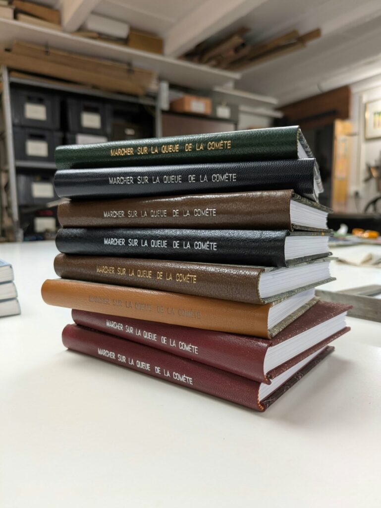 Préparation des Comètes, reliées, pour notre séance de dédicace à la Librairie-galerie Laure Matarasso. Un beau travail de @vincentbottassodaideri de l’Atelier RAISE à découvrir le 26 février prochain.